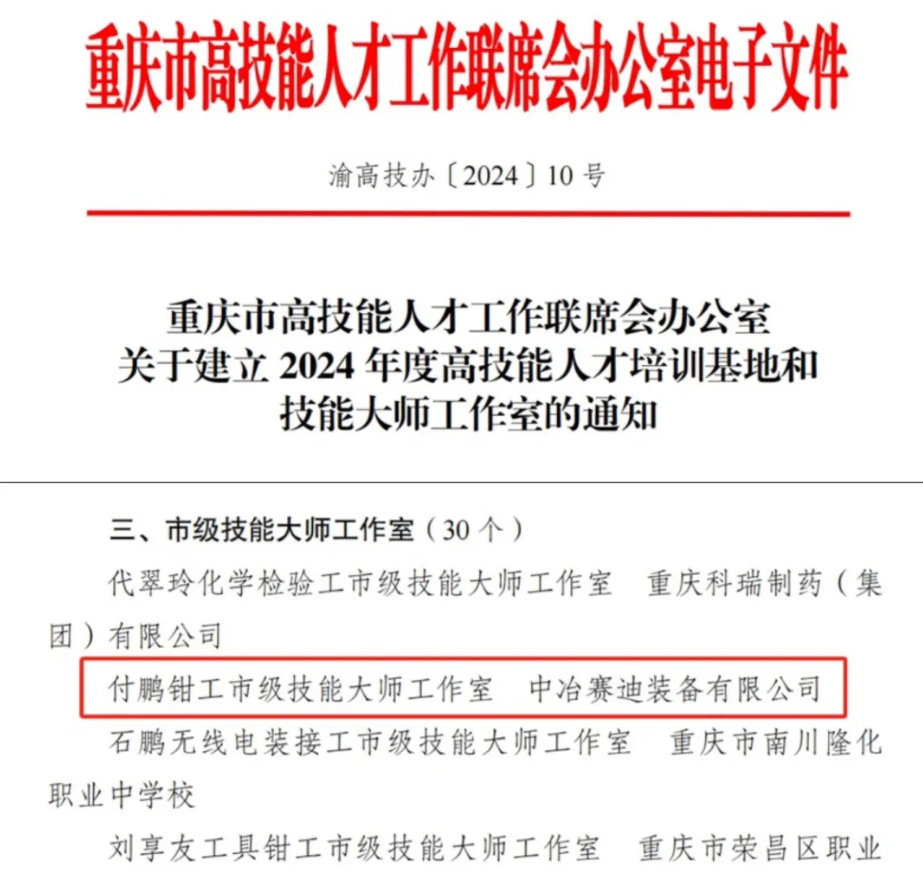 9月24日,重慶市高技能人才工作聯(lián)席會(huì)辦公室下發(fā)《關(guān)于建立2024年度高技能人才培訓(xùn)基地和技能大師工作室的通知》,賽迪裝備申報(bào)的“付鵬鉗工市級(jí)技能大師工作室”成功獲批建設(shè)。技能大師工作室由重慶市委組織部與重慶市人力資源和社會(huì)保障局聯(lián)合組織建立,本次成功獲批是對(duì)公司技能人才培養(yǎng)工作的認(rèn)可和支持,為公司今后的高技能人才隊(duì)伍建設(shè)提供了更加堅(jiān)實(shí)的政策保障。